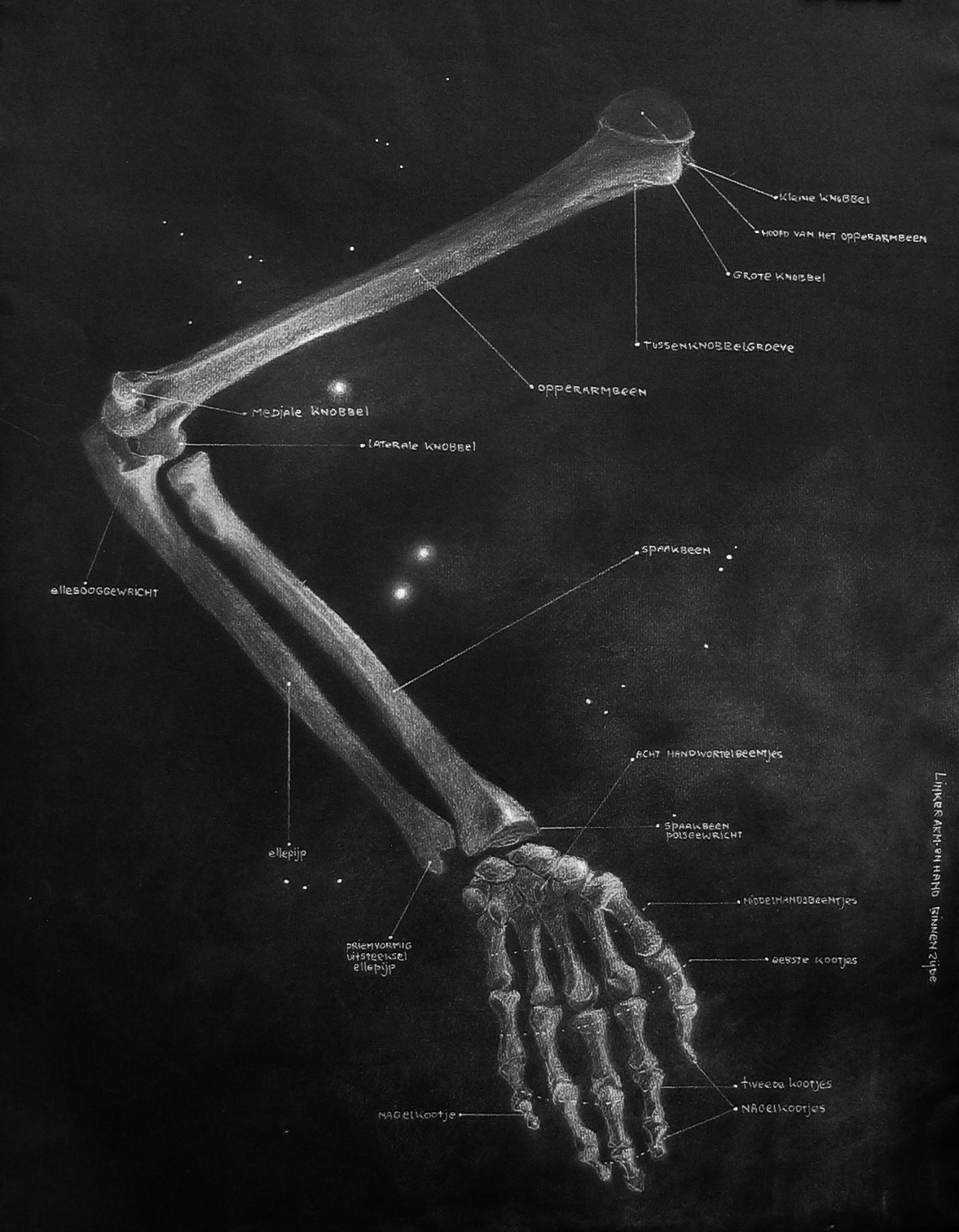 anatomische tekening van arm wit krijt op zwart papier